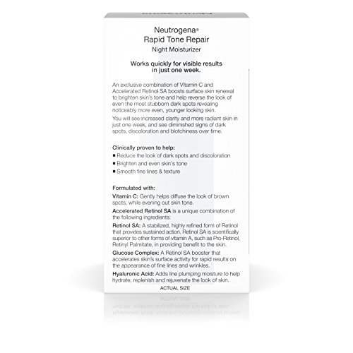 Neutrogena Rapid Tone Repair Night Moisturizer targets dark marks to help brighten and even skin tone fast. For radiant, younger-looking skin, this moisturizer is clinically proven to reduce the look of dark spots and discoloration in just one week. Retinol SA helps smooth fine lines and diminishes the look of age spots. Vitamin C gently helps diffuse the look of brown spots while evening out skin tone. This brightening moisturizer is gentle enough for nightly use.