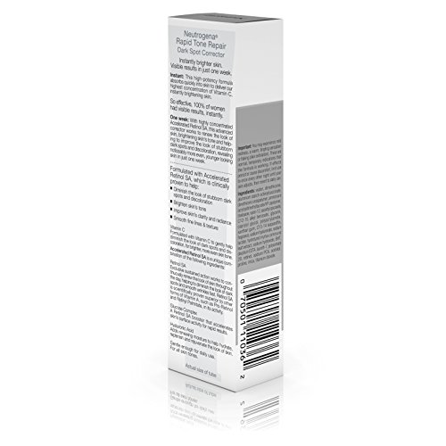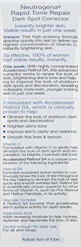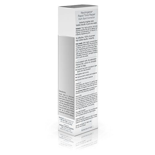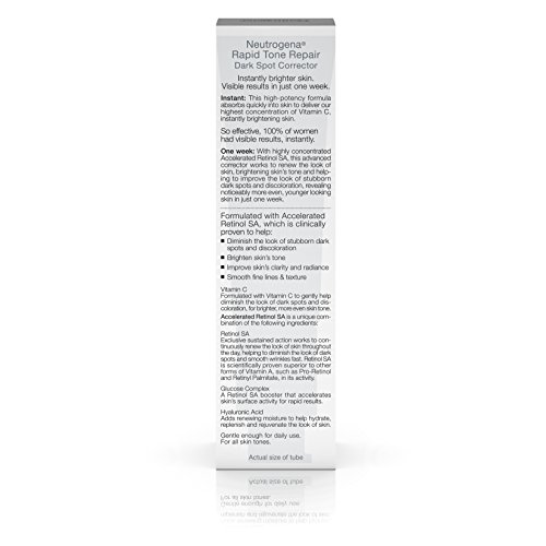 Use Neutrogena Rapid Tone Repair Dark Spot Corrector to help reveal younger-looking skin. This advanced corrector works to renew the look of skin, by helping to brighten skin tone. It helps improve the look of stubborn dark spots and discoloration, revealing noticeably more even, younger-looking skin in just one week. This dark spot corrector with Accelerated Retinol SA works to continuously renew the look of skin throughout the day. The formula also contains vitamin C that gently helps diminish the look of dark spots and discoloration for brighter, more even skin tone. Neutrogena Rapid Tone Repair Dark Spot Corrector is gentle enough for all skin tones.