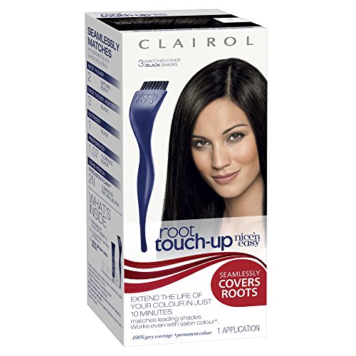 Nice'n Easy Permanent Hair Dye Root Touch Up Black 3 Range: Root Touch-up 10 minute flawless root makeover. Guaranteed to match other leading brands. 100% Grey Coverage.PERMANENT COLOUR.*See pack for details. Benefits The flawless beauty makeover for your roots ... just 10 minutes between colourings. Q: Why is Root Touch-Up different? A: Root Touch-Up is specially designed to target new root regrowth and restore beautiful, natural-looking colour in just 10 minutes between colourings. Q: How does it work? A: Our Precision Colour Brush allows you to easily apply the Colour Matching Root Creme just where you need it, so you never over-colour the rest of your hair. Just 10 minutes and roots are gone! Q: Will it match MY shade and brand? A. Yes. Our Colour Matching Root Creme contains a perfect blend of tones that are proven to match your shade -no matter which leading brand you use. Warnings or Restrictions CAUTION: Avoid contact with eyes. If contact occurs, rinse thoroughly with water.
