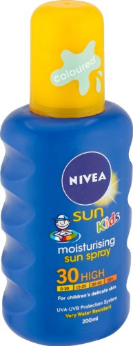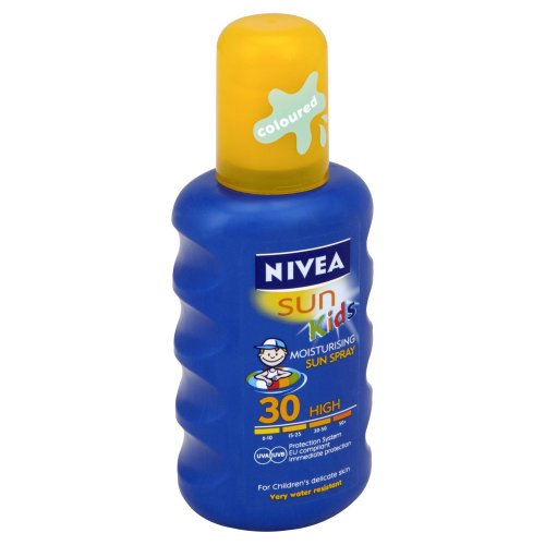 Nivea SPF30 Moisturising Sun Spray provides in sun protection whilst nourishing children's delicate skin. The disappearing coloured spray makes it easy to ensure even coverage. An enhanced UVA/UVB filter system immediately protects skin from UV rays while vitamin E nourishes and protects skin from long-term damage. The quickly absorbed, very water resistant formula is suitable for all skin types.