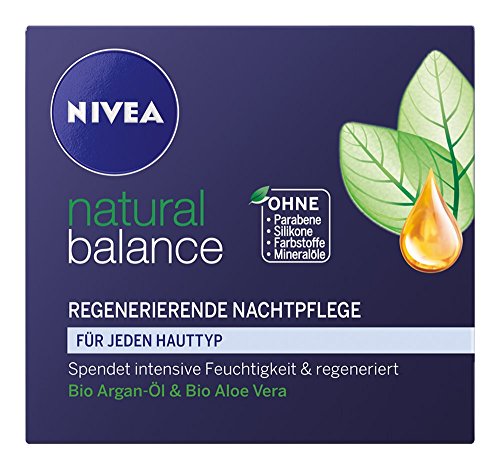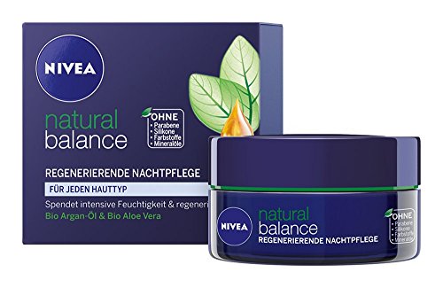 95% of natural origin. For all skin types. Intensively moisturises & regenerates. With bio argan oil & bio aloe vera. Suitable for sensitive skin. No parabens, silicones, colourants or mineral oils. Skin compatibility dermatologically approved. Argan Oil Our high quality organic Argan Oil is a natural source of Vitamin E. Aloe Vera Known for its moisturising properties, our organic Aloe Vera hydrates and cares for skin. Skin Care Expertise Meets Nature For its Pure & Natural range, NIVEA® experts have combined 100 years of skin research with effective ingredients from nature. At night, skin is at its most receptive to moisture, regular use of a moisturiser helps skin to regenerate. Power of Nature That Shows on Your Skin The gentle Pure & Natural Regenerating Night Cream for all skin types: Provides intensive 24h moisture for a soft, smooth skin Supports the skin's regenerating process during the night with its caring formula containing Provitamin B5 Enriches skin's natural healthy glow. Argan Oil and Aloe Vera are organically grown.