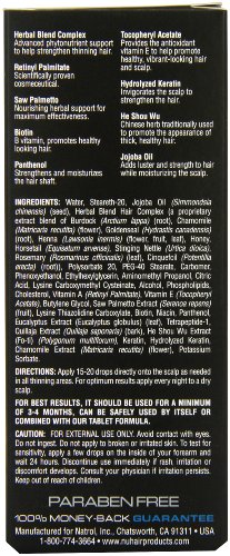Nu Hair Thinning Hair Serum provides intensive nourishment for excessively thinning hair, receding hairlines, breakage around the hairline, and any area of the scalp that has poor hair density. Nu Hair Thinning Hair Serum utilizes a lipoceutical, time-released, multiphase delivery system in which vital nutrients are supplied to nourish the follicle receptor sites. Nu Hair Thinning Hair Serum is comprised of hair nourishing nutrients such as: Herbal Blend Hair Complex - Advanced phytonutrient support to help strengthen thinning hair. Retinyl Palmitate - Scientifically proven nutraceutical. Saw Palmetto - Nourishing herbal support for maximum effectiveness. Biotin - B vitamin promotes healthy looking hair. Pantothenol - Strengthens and moisturizes the hair shaft. Tocopheryl Acetate - Protects hair with the antioxidant vitamin E. Hydrolyzed Keratin - Promotes cellular balance of scalp. He Shou Wu - Chinese herb traditionally used to promote the appearance of thick, healthy hair. Jojoba Oil - Adds lustre and strength to hair. Moisturizes the hair and scalp.
