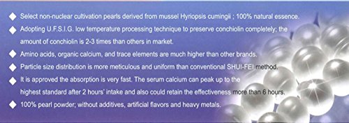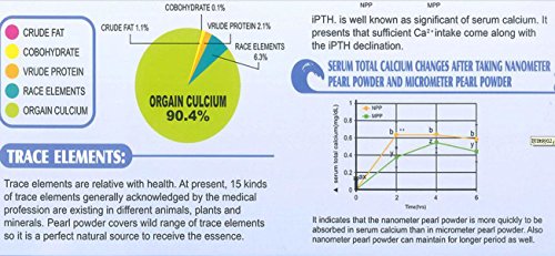 What you are buying here is 50g DR T&TTM top quality pure patent nanometer 0.5-0.65um pure Hydrolyed seawater pearl powder, , suitable for oral take or cosmetic use. 1.Select non-nuclear cultivation pearls derived from mussel hyriopsis ; 100% natural essence. 2.U.F.S.I.G. Adopting U.F.S.I.G low temperature processing technique to preserve pearl protein completely , amount of pearl protein is 2-3 times than others on the market. 3.The contents of Amino acids, organic calcium, and trace elements are much higher than others brands. 4.The particle size distribution is more meticulous and uniform than conventional SHUI-FEI method. 5.Per proved the absorption is very fast . The serum calcium can peak up to the highest standard after 2 hours' intake and also could retain the effectiveness more than 6 hours. 6.100% Naturally , without heavy metals. Choose high standard pearl powder as raw material .The produced by internationally renowned enterprise-Lucoral & Lupearl which has been engaged in this filed more than 40 years. All pearl are bred in clean seawater, specifically choose the jewelry grade ones with higher activity to processing. This raw material is processed through conventional method, all quality assurance steps we take expect to purify the complete essence Ultrasonic waves of high intensity ultrasound generate cavitation in liquids. Cavitation causes extreme effects locally which will help comprehensively clean surface of pearls and get rid of the pearl's unique odor. The use of liquid nitrogen as the grinding media, to achieve ultra-low temperature grinding could avoid pearl powder from qualitative change in higher temperature. This technology will guarantee to collect the finest pearl powder in particle size and characters. 1. Patented low-temperature procedure 2. The inspection report of non-Heavy metal 3. Report of Hydrolyed Amino Acids 4. Report of Pearl powder's particle size. Pearl Powder Benefits Explained