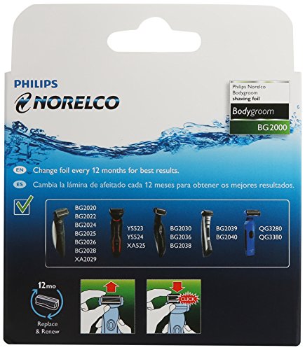 Designed for use with Philips Norelco Bodygroom models, the Philips Norelco replacement shaving foil safely trims and shaves any part of your body. Suitable for use everywhere or your body--from your chest and abs to your back and shoulders--the Bodygroom works well wet, dry, or even in the shower. Its hypoallergenic foil protects sensitive skin against nicks, cuts, and irritation, and its stainless steel blades ensure long-lasting performance. The BG2000 Bodygroom replacement shaving foil comfortably shaves any area of your body. Replace the foil 6-12 months year for best results