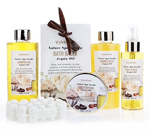 Pinkleafs' bath and body line is a remarkable blend of ingredients selected to contribute to both health and beauty. These products are carefully handcrafted in modest-sized kettles, not mass-produced in giant vats. The resulting blend is uncommonly easy to apply and absorbs quickly, leaving your skin soft and silky all day. Enriched with Argan oil, our products hydrates your skin and restores it's natural glow. Glycerin provides additional moisturizing without the greasy residue that petrolatum-based lotions leave behind. Very popular in skin care line- Pinkleaf body lotion, body spray, shower gel, bubble bath,and bath salts are gentle enough for sensitive skin and doesn't irritate cracked, chapped skin. The gift set contains a convenient assortment of body product your loved one will delight in. The Nature Spa Vanilla bath and body products have a perfectly balanced fragrance of sweet vanilla and soft essential oils. This sheer and romantic scent glides easily from day to evening. Nothing is smoother. Your skin will tell the difference!