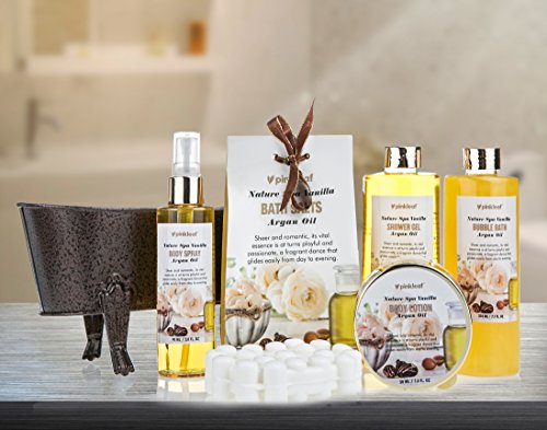 Pinkleaf Nature Spa Vanilla, Argan Oil, Bath Gift Set, in Antique Brass Looking Tub is available in Bath Pearls & Flakes