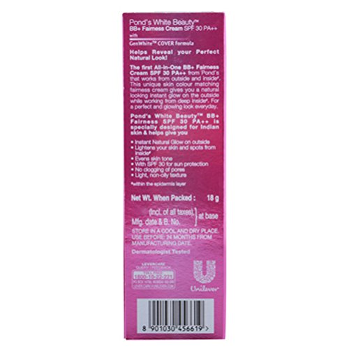 Pond's white beautyTM BB+ fairness cream is the perfect complement to the Pond's daily face care regime. Instant natural coverage. • Non-pores clogging • Light, non-oily texture • Lightens from within epidermis level • Reduces dark spots • Evens skin tone • SPF 30 PA++ protects from UVA, UVB and visible light. The science behind Pond's white beauty TM BB+ fairness cream: With the Pond's Institute's dual-acting sophisticated skin lightening GenWhiteTM Cover Formula and SPF 30 PA++ advanced sunscreen protection, Pond's white beautyTM BB+ fairness cream not only improves skin texture and effectively lightens skin from within but also provides Natural looking instant glow for Indian skin. Clinically proven to lighten skin tone and reduce dark spots, GenWhiteTM Formula is enriched with a powerful mix of Vitamin B3, Vitamin E, Allantoin and advanced superior sunscreen protection.