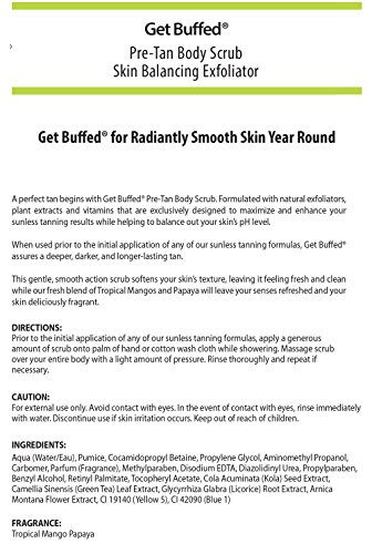 Description: A perfect tan begins with Get Buffed pre-tan body scrub. Formulated with natural exfoliators, plant extracts and vitamins, Get Buffed is exclusively designed to maximise and enhance your sunless tanning results. Used prior to the initial application of Pro Tan sunless tanning formulas, Get Buffed assures a deeper, darker, longer-lasting tan. This gentle, smooth action wash softens your skin's texture leaving it feeling fresh and clean while the awakening aroma of fresh cut mango and lime leave your senses soaring. Every Pro Tan formula is a living and growing embodiment of the Pro Tan philosophy: to work with athletic physiques in their finest state, to treat the skin as a soft canvas, to tone and tan the skin to reflect the individual and reveal their true definition without compromise. To realise this philosophy, Pro Tan believes that utilising the latest in skin care ingredients and tanning technology at optimum levels is required to deliver perfect looking skin tone and colour. A formula that has allowed Pro Tan to be the number one self tanning product trusted by bodybuilders, fitness competitors and models alike since 1987. It is this trust that makes Pro Tan continue its success while assuring you the highest quality skin care and tanning formulas designed to help make you number one. Choose the Pro Tan range for that unbeatable tanned look. World renowned for its formula, Pro Tan is the professionals choice when it comes to indoor and outdoor tanning.