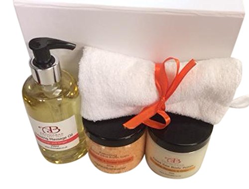 Spa Relaxing Pamper Kit 100% Natural Aromatherapy Gift Set with Orange & Ginger Body Massage Oil, Relaxing Bath Salts, Moisturising Body Polish and Spa Mitt is available in Sets