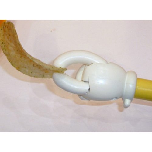 * when we want to eat crisp,just hold the rod of the hand,push the button,the thumb and the forefinger can be closed and pick up the crisps.