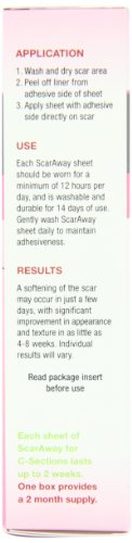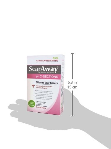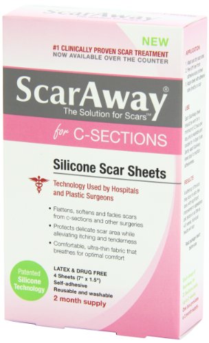 Scarawaytm helps restore raised and discolored c-section scars to a more natural color and texture, using the same technology trusted by burn centers and plastic surgeons.using scar awaytm on newly healed c-section wounds helps prevent the formation of unsightly scars. even scars that are years old show significant improvement with scar awaytmpreviously available only to medical professionals. now available direct to you.made from a patented material that provides a unique combination of breathability, flexibilty, washability and adhesiveness with a silky fabric backing for optimal convenience and comfort, even under clothing! scaraway c-section scar treatment strips was developed specifically for moms recovering from c-sections. each sheet is 7" long and 1.5".scar away for c-sections comes with 4 7" x 1.5" easy-to-apply, self-adhesive silicone scar treatment sheets.~ latex and drug free ~ the smart choice for new moms.patented silonĀ® sheets mimic the natural barrier function of normal, healthy skin, increasing hydration and temperature at the scar site, working to soften scar tissue, reducing its development and causing it to fade away faster.scaraway also protects your delicate scar area and alleviates the itching and tenderness often associated with scars.so comfortable, you'll forget you're wearing it! you don't have to live with problem scars. scaraway for c-sections can be your next little miracle...