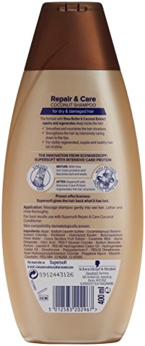 The formula with Shea Butter and Coconut Extract repairs and regenerates deep inside the hair. It smoothes and nourishes the hair structure and strengthens the hair by intensively caring down to the tips. For visibly regenerated, healthy hair full of shine. For best results use with Supersoft Repair & Care Coconut Conditioner.