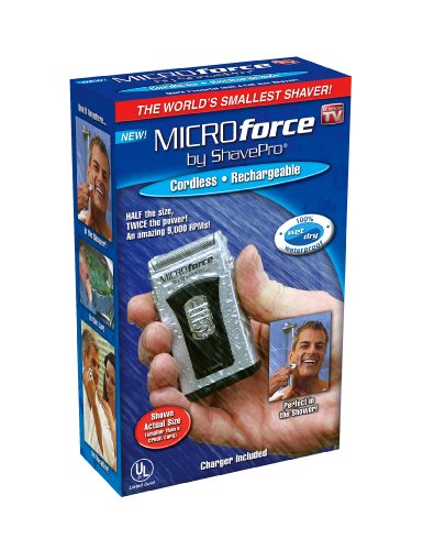 Microforce rechargeable electric shaver lasts up to 10x longer than standard battery shavers. Whether at home or traveling the ultra compact, waterproof designallows for easy portability. Compact - smaller than a credit card! The sleek metal top provides a close, clean shave with a surface area twice the size of conventional blades. Plastic, steel. Includes one rechargeable battery.31/4 x 2 x 3/4".
