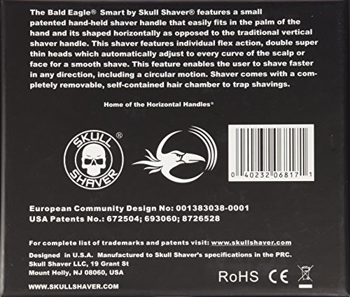 The Bald Eagle Smart-G model brings our most affordable Bald Eagle Shaver to the UK and EU markets. Just like all of our shavers, the Bald Eagle Smart-G lets you experience a fast and smooth, dry or wet shave. For wet shaving, please use shaving foam. Shaving gel is not recommended as its density and stickiness can clog the blades and hurt performance. The Grip The patented ergonomic design fits in your hand like no other and shaver gives you extra reach for the back of head and body. For best results, hold the shaver between your fingers. Please see the images for an example. The Blades Five large, flexing shaver heads with rotary cutters allow for a fast and close shave. The rotary blades allow you to shave in any direction. You can shave while moving the shaver forward, backward, even in a circular motion. This significantly cuts down on the time it takes to shave, all while you experience no nicks, no cuts, and no burns. Each blade flexes independently, allowing the blades to contour to any head or face shape, giving you an even shave over even the hardest to shave spots. Battery and Charging The Bald Eagle Smart-G features a high performance lithium ion battery that provides up to 90 minutes of usage on a single charge. The lithium ion battery runs strong until it is fully depleted, giving you consistent performance from beginning to end. The battery fully recharges after 2.5 hours. Cleaning To clean, simply run the shaver and dip the blades in the Skull Shaver Rinse Stand or a bowl of water. The running blades will self-clean and push out shavings. The official Skull Shaver rinse stand is available separately. Use and For Best Results We recommend cleaning the blades frequently in s Skull Shaver Rinse Stand or a bowl of water. Simply dip the running blades in the water occasionally throughout the shave.