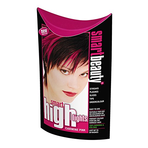 Smart Beauty Carmine Pink Highlights - This home hair colour kit will put vibrant pink coloured streaks into your hair. Smart Highlighting kits add style and texture, and will transform your hairstyle giving subtle natural looking multi-dimensional vibrant pink coloured highlights. Designed to easily create professional salon highlights, flashes, slices, tips and undercolour at home. It works well on dark hair and on blonde or lightened hair for a more vibrant colour. Hair Style Techniques: For fine highlights we recommend the use of a highlight cap and hook, available separately For flashes, slices and tips we recommend the use of normal kitchen foil You will also need a non-metallic mixing bowl, such as a glass container. For Long Hair: Two packs may be required if hair is longer than 20cm or you want to increase number of highlights