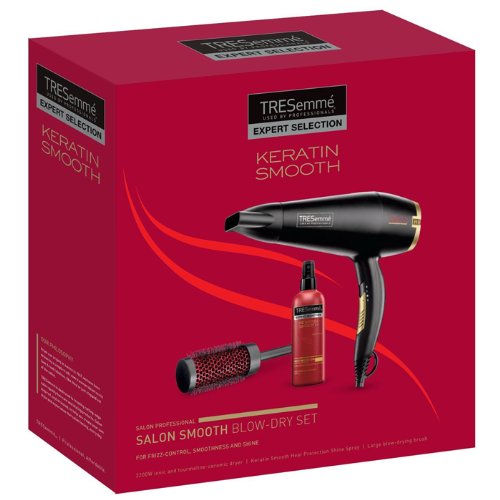 nspired by the salon, the TRESemmé Expert Selection Keratin Smooth Dryer delivers a top quality 2200W performance for fast drying and effortless styling. There are 2 heat and speed settings as well as a cool setting to set your style and a salon style concentrator nozzle for even faster drying results. The TRESemmé Keratin Smooth dryer comes with tourmaline-ceramic technology and ionic conditioners to enhance smoothness and shine. Negative ions are released in a constant stream to neutralise static charge smoothing the cuticle of the hair for a shiny, smooth and healthy looking finish.