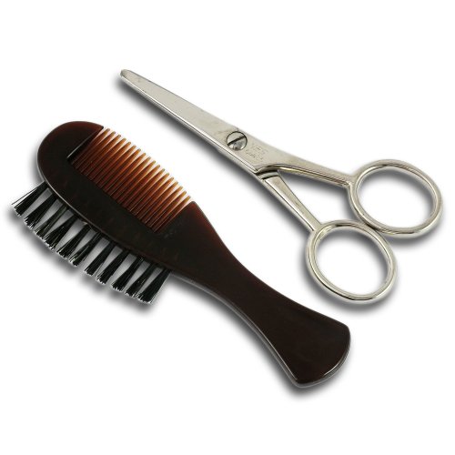 Taylor of Old Bond Street Beard & Moustache Grooming Kit: The Taylor of Old Bond Street Beard and Moustache kit helps keep your beard and moustache looking trim and tidy. The nickel scissors are 11cm long with sharp cutting blades precision trimming of beards, moustaches and eye brows. Backed with natural bristles, the imitation tortoiseshell moustache comb has smooth teeth which are suitable for dry and fragile hairs. Taylors Beard and Moustache grooming kit comes in a smart black leather case with a stud fastening.