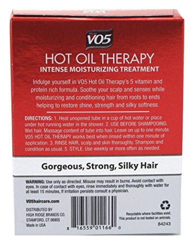 Indulge yourself in VO5 Hot Oil Therapys 5 vitamin and protein rich formula. Soothe your scalp and senses while moisturizing and conditioning hair from roots to ends, helping to restore shine, strength and silky softness. Vitamin E