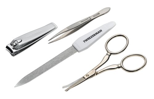 Four high quality Tweezerman personal care tools that deliver the utmost precision and reliability for men's grooming needs. Kit includes tweezerette, stainless steel fingernail clipper, facial hair scissors, and pocket nail file, and is conveniently packaged in a sturdy storage case.