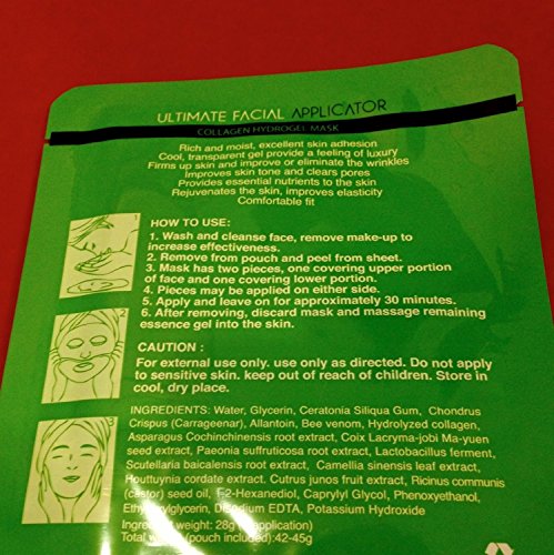 ULTIMATE COLLAGEN FACIAL APPLICATOR ,MASK it works FOR SKIN REJUVENATION 4 masks ULTIMATE FACIAL APPLICATOR COLLAGEN MASK Compared with the traditional standard essence masks, Hydrogel Mask provides extraordinary moisturizing quality that has been proven to be superior to the traditional essence masks by up to 18%. What's more, the new concept Thermo-Sensible Collagen Hudrogel mask gradually melts its active ingredients into skin, reacting to the skin temperature. . It also utilizes the bio-matrix method, which is safe for the human body. This gel mask has a great cooling effect and it keeps skin moisturized as well. The enhanced moistness and adhesive ability guarantees effective delivery of active ingredients into the deeper skin without damage, while resolving the problem of other sheet-type masks' losing active ingredients.minimize the appearance of fine lines and wrinkles in just 45 minutes. Skin looks and feels softer, smoother, and revitalized with a healthy glow. Continuously hydrates for fresher, more luminous skin and a younger-looking you. Deep hydration Collagen Produces a lifting effect Firms and invigorates skin Softens fine lines & wrinkles Results in as little as 30 minutes INDICATIONS AND USAGE How to Use: 1. After applying toner, pull out a mask sheet from the package and unfold. 2. Apply the mask sheet onto the face from the lower part (chin) of the face towards the forehead. 3. Remove the mask sheet after 30-40 minutes. Gently pat to absorb the remained formula into skin. - Use 2-3 times a week for the best result. - Do not reuse the mask sheet.