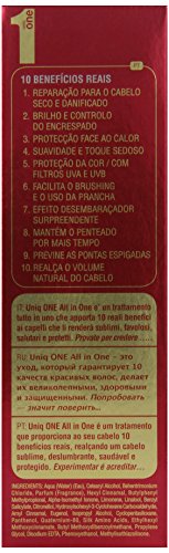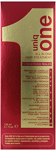 Uniq One All In One Hair Treatment Repair for dry and damaged hair. Shine and frizz control. It also protect from heat. Silkiness and smoothness. Easier brushing and ironing. Incredible detangling. Long lasting hairstyle.