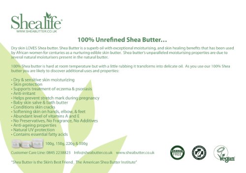 FOR OVER 1000 YEARS, WOMEN HAVE USED SHEA BUTTER, AS A MIRACLE CREAM, FOR TREATING DRY SKIN, AGING SKIN, AND DAMAGED SKIN. PURE SHEA BUTTER IS UNIQUE FOR ITS COSMETIC AND THERAPEUTIC BENEFITS.USE FOR DRY, SENSITIVE, SUNBURNT OR PEELING SKIN, SMALL SKIN WOUNDS, LIP SCABS, SKIN RASHES, AS AN ANTI-AGEING SKIN SALVE, A TOUGH SKIN SOFTENER (ON HANDS, FEET AND ELBOWS), FOR STRETCH MARK PREVENTION, AS A MASSAGE OR BASE OIL, TO SUPPORT TREATMENT OF ECZEMA OR PSORIASIS, OR AS A BATH EMOLLIENT, HAIR & SCALP CONDITIONER AND SHAVING CREAM.