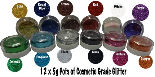 The glitter is supplied in 12 x 5g pots, colours provided: Black, Bronze, Copper, Emerald Green, Fuchsia, Gold, Purple, Red, Royal Blue, Silver, Turquoise & White