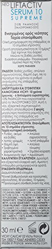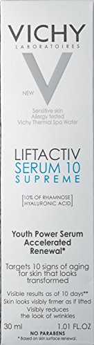 Targets 10 signs of ageing for skin that looks transformed Liftactiv Serum 10 Supreme targets 10 signs of ageing whilst accelerating surface skin cell renewal. With over 10 years of research and 10 proofs behind it, including instrumental and clinical tests, it is Vichy's most powerful firming serum. Targets 10 signs of ageing for skin that looks transformed10 signs of ageing look improved: 1. Wrinkles2. Loss of firmness3. An uneven complexion4. Dullness5. Fine lines6. Tired features7. A loss of tonicity8. Dehydrated skin9. A loss of plumpness10. Signs of fatigue New formula vs Old Formula. Tested under dermatological control. Suitable for sensitive skin. Hypoallergenic. No Parabens.