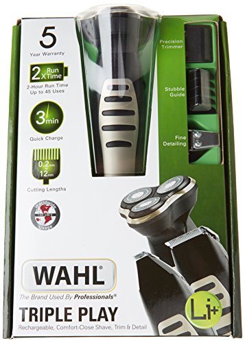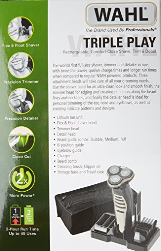The Wahl Lithium Ion Triple Play is the Worlds 1st full size shaver & trimmer grooming station. A shaver, trimmer and detailer all in one. The only shaver with a 2 hour run time - up to 45 shaves on a single charge. PLUS a 3 minute quick charge facility for over 4 minutes use - perfect for a quick touch up if you've forgotten to charge. The Wahl Lithium Ion Triple Play is a three in one grooming kit that offers a Flex and Float shaver attachment giving you an ultra-clean, smooth shave. The precision trimmer attachment has pro blades for edging and definition and the precision detailer can do intricate designs, or personal trimming of the ear, nose and brow. Personalise your style with three beard combs and a 6-position guide comb. Whats in the box: Trimmer Flex & Float Shaver head Precision trimmer head Precision detailer head 4 beard guide combs - stubble, medium, full plus variable 6 position trimmer guide comb Storage / travel pouch Charger & Storage Stand Cleaning brush, blade oil, instructions, beard & moustache comb & foil guard