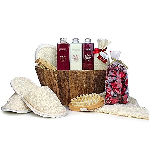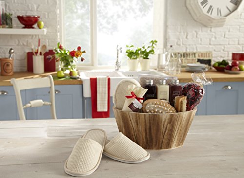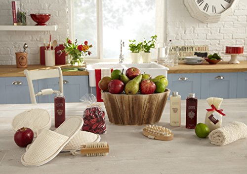 Our gorgeous Rich Plum oval bowl is filled with a vast collection of toiletries and accessories. The set includes a high quality nail brush, a wooden cellulite massager (worth £8 on the high street), a sisal loofa sponge (worth £7 on its own), a pair of waffled bath slippers and a 100% cotton face towel worth £8 on its own. So much value has been packed into this gift and we haven't even started on the after uses of the actual bowl itself. The smart wooden oval bowl can be reused as a fruit bowl in you kitchen or even a planter for your conservatory. There is just so much versatility in the after uses of the bowl itself but the toiletries themselves are so special and such a treat..