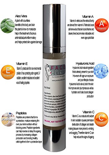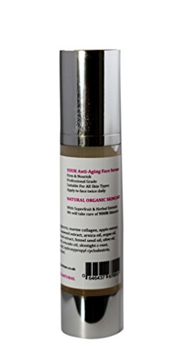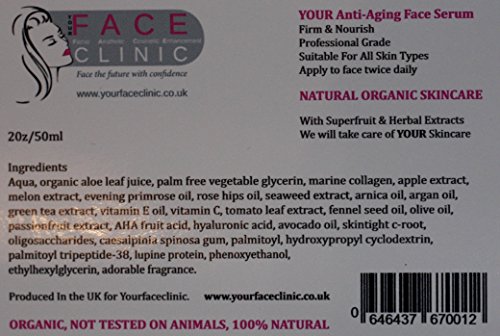 YOURFACECLINIC YOUR Anti-Aging Facial Serum Firm & Nourish Professional Grade Suitable For All Skin Types Apply to face twice daily NATURAL ORGANIC SKINCARE With Superfruit & Herbal Extracts We will take care of YOUR Skincare 50ml Size Ingredients Aqua, organic aloe leaf juice, palm free vegetable glycerin, marine collagen, apple extract , melon extract, evening primrose oil, rose hips oil, seaweed extract, arnica oil, argan oil, green tea extract, vitamin E oil, vitamin C, tomato leaf extract, fennel seed oil, olive oil, passionfruit extract, AHA fruit acid, hyaluronic acid, avocado oil, skintight c-root, oligosaccharides, caesalpinia spinosa g BENEFITS- Start to notice younger looking skin with this clinical Formula! YOURFACECLINIC Anti Aging Serum Delivers Long-Lasting Results with Many Benefits For those with flawed skin with any of these issues, this Anti Aging Serum is perfect for you. - Wrinkles and fine lines - Damaged skin - Dehydrated, dry, rough or flaky skin - Uneven skin tone and texture - Dark circles and puffiness around eyes - Diminishes appearance of wrinkles and fine lines - Reduces hyperpigmentation - Helps you achieve soft, supple, firmer skin - Reduces puffiness and appearance of dark circles - Get an overall vibrant, healthy complexion YOURFACECLINC Anti Aging Serum contains high-quality, organic Superfruit & Herbal ingredients to maximize results. - Contains Vitamin C and other antioxidants to help renew skin - Lightweight formula glides on smooth and absorbs quickly - Can be worn under makeup - Made in the UK - Not tested on animals -100% Natural MANUFACTURER GUARANTEE: YOURFACECLINIC backs their products with a 100% Satisfaction Guarantee or Your Money Back!