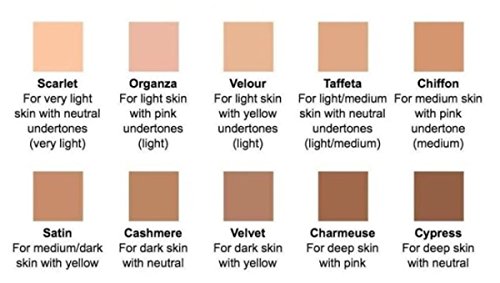 Shades: Choose the correct foundation from the list below: Scarlet For very light skin with neutral undertones (very light) Organza For light skin with pink undertones (light) Velour For light skin with yellow undertones (light) Taffeta For light/medium skin with neutral undertones (light/medium) Chiffon For medium skin with pink undertone (medium) Satin For medium/dark skin with yellow undertones (medium/dark) Cashmere For dark skin with neutral undertones (dark) Velvet For dark skin with yellow undertones (dark) Charmeuse For deep skin with pink undertones (dark/deep) Cypress For deep skin with neutral undertones (deep) Ingredients: WATER, CYCLOPENTASILOXANE, HYDROGENATED POLYISOBUTENE, PROPYLENE GLYCOL, TITANIUM DIOXIDE, ALUMINUM STARCH OCTENYLSUCCINATE, OZOKERITE, HEXYLENE GLYCOL, MALTODEXTRIN, DISTEARDIMONIUM HECTORITE, DISODIUM STEAROYL GLUTAMATE, DIAZOLIDINYL UREA, ACRYLATES COPOLYMER