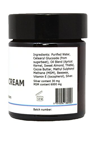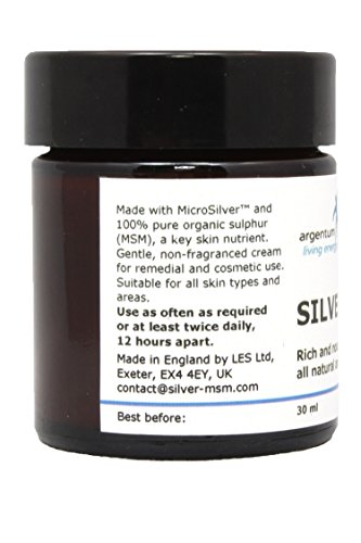 The argentum plus Silver-MSM Cream is a superb way of applying silver and MSM (Methyl Sulfonyl Methane, a bio-available organic form of sulphur) to the skin. Its all natural ingredients offer all-round antiseptic, anti-bacterial, and anti-fungal action unsurpassed by any skin care products we have seen: The combination of pure MicroSilverTM with cold-pressed oils and MSM powder produces an outstanding cascading antioxidant skin cream, which supports healthy skin renewal by providing organic sulphur deep in the epidermal layers, where it is most needed for cell repair. MSM is the most overlooked nutrient skin cells need for building flexible, fully functioning cell membranes, making the skin more resilient. Silver has proven anti-microbial properties and trials have shown MicroSilverTM to be very effective as well as safe for long term use. MicroSilverTM particles are pure elemental silver and scientifically proven to release active silver ions for up to 12 hours, so using Silver-MSM Cream twice daily will enhance your skin's natural defenses. Non-steroidal, chemical free, cruelty free skin care. Does not the stain the skin. Available in 30 ml, 60 ml, 120 ml and 3 x 120 ml sizes.