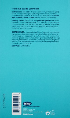 Treat your hands to a little helping of heaven with Bliss Glamour Gloves and watch them wave 'goodbye' to dryness, chapping, and signs of aging. Glamour Gloves have a special polymer-gel lining that force feeds dry skin with essential softening agents-grape seed oil, jojoba oil, olive oil, and vitamin E. Give your hardworking hands 20 minutes to bask in this Bliss and enjoy super-soft, supple, youthful results.