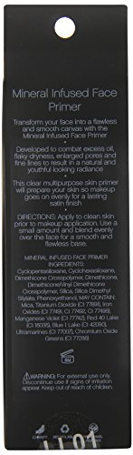 Transform your face into a flawless and smooth canvas with the Mineral Infused Face Primer. Developed to combat against excess oil, flaky dryness, enlarged pores and fine lines. This clear multipurpose skin primer will prepare your skin so makeup goes on evenly for a long lasting satin finish. DIRECTIONS Apply to clear skin prior to makeup application. Use a small amount and blend evenly all over the face for a smooth and flawless base. INGREDIENTS Cyclopentasiloxane, Cyclohexasiloxane, Dimethicone Crosspolymer, DimethiconeDimethiconeVinyl Dimethicone Crosspolymer, Silica, Silica Dimethyl Silylate, Phenoxyethanol May Contain Mica, Titanium Dioxide CI 77891, Iron Oxides CI 77491, CI 77492, CI 77499, Manganese Violet CI 77742, Red 40 Lake CI 16035, Blue 1 Lake CI 42090, Ultramarines CI 77007, Chromium Oxide Greens CI 77288, Tin Oxide CI 77861 Net Wt. 0.49 oz. 14 g