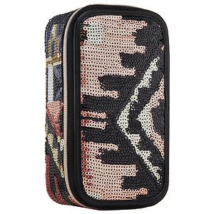 A sequined brush box filled with five full-size, limited-edition makeup brushes.